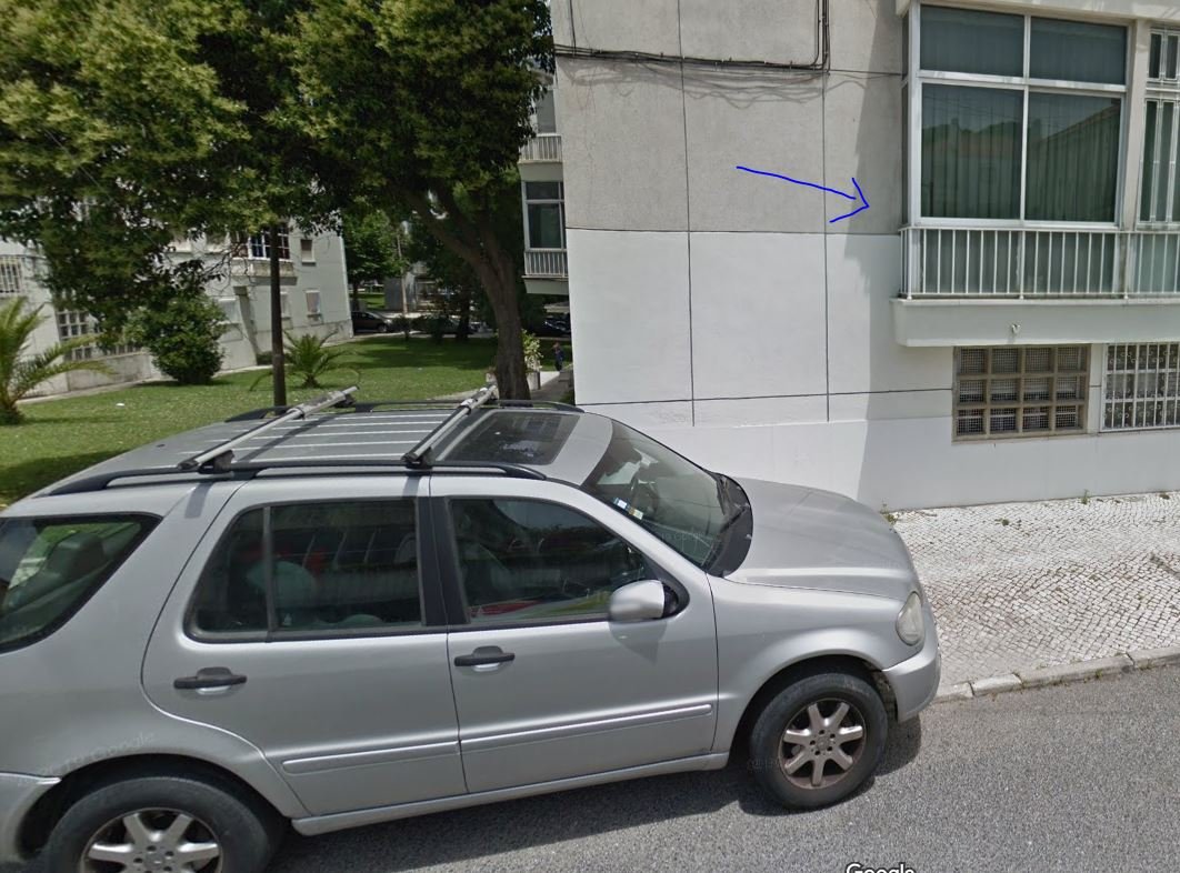 Eu vivo num apartamento, onde não há parqueamento, ou garagem, no entanto, através de uma das janelas (vivo num primeiro andar), poderia ligar o carro à tomada lá de casa, pois a distância é curt até à rua,como podem ver. Faz de conta que o meu carro é aquele que se vê na foto, chego-o mesmo junto da janela, deixando espaço para os traseuntes passarem. Isto é legal fazer? Se sim, há possibilidade de alguém por maldade, conseguir cortar o cabo? Não sei se o deixaria pelo chão, ou se o esticaria de forma a ficar "no ar".