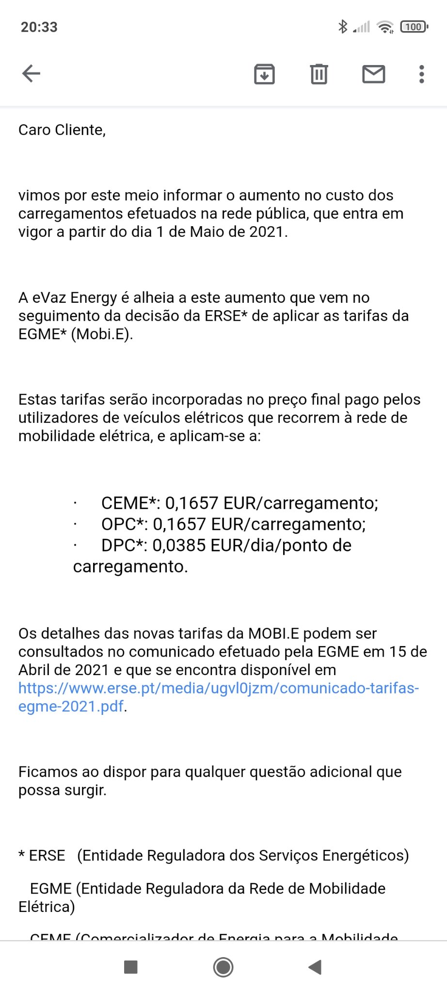 pbaptista Escreveu: 18 abr 2021, 20:25 Eu na Ionity, em Portugal (para já só na estação de serviço de Almodôvar) e no resto da Europa tenho o preço de 0,55€/kwh.