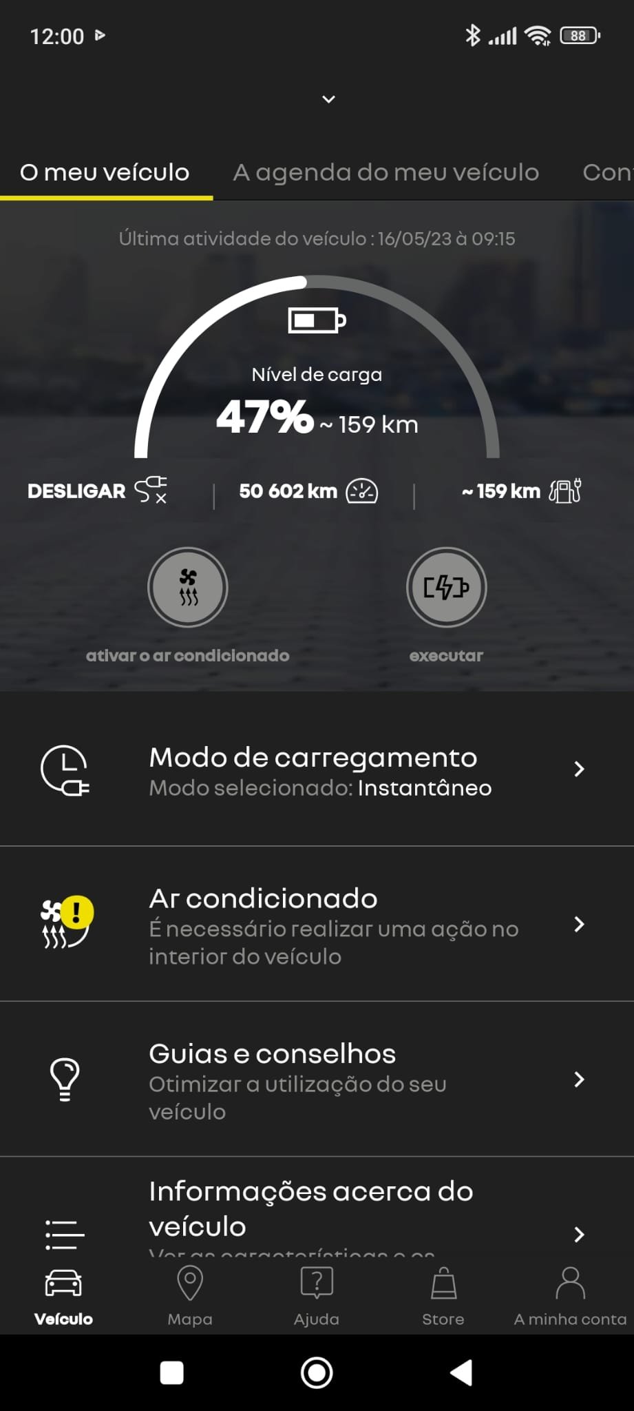 Na 1.ª imagem temos a imagem que nos é mostrada quando abrimos a app, onde podemos verificar a carga e os km que ainda podemos fazer.