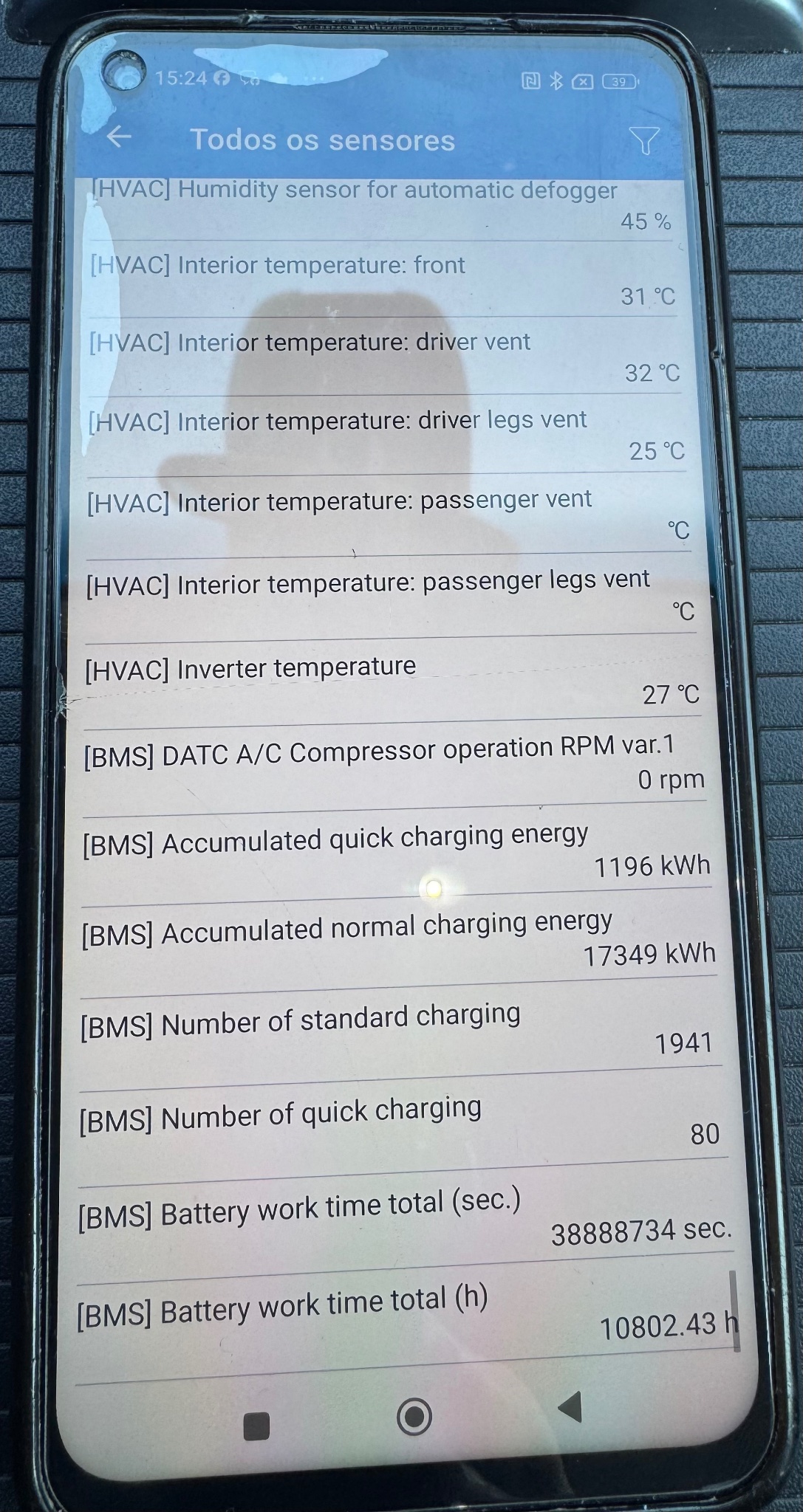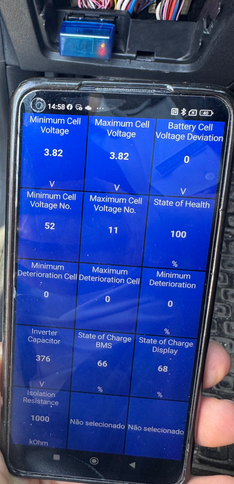 Quanto ao estado da bateria, o antigo proprietário enviou-me um print do car scanner com os parâmetros bastante simpáticos. Ontem fui à oficina https://secondcycle.pt para mostrar o carro e fizeram um diagnóstico à bateria; o resultado foi muito positivo e correspondente ao print do car scanner.