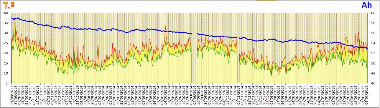 Já nem me lembrava da utilização desse fabuloso expediente na adivinhação de degradações futuras. Sendo aos 51,50 Ah, ainda não é para breve. Pode ser impressão minha, mas acho que as temperaturas têm sido mais altas neste verão, pelo menos aqui por Tábua. Mesmo assim o que vejo é que não é para 2015. O mais provável é maio de 2016.
