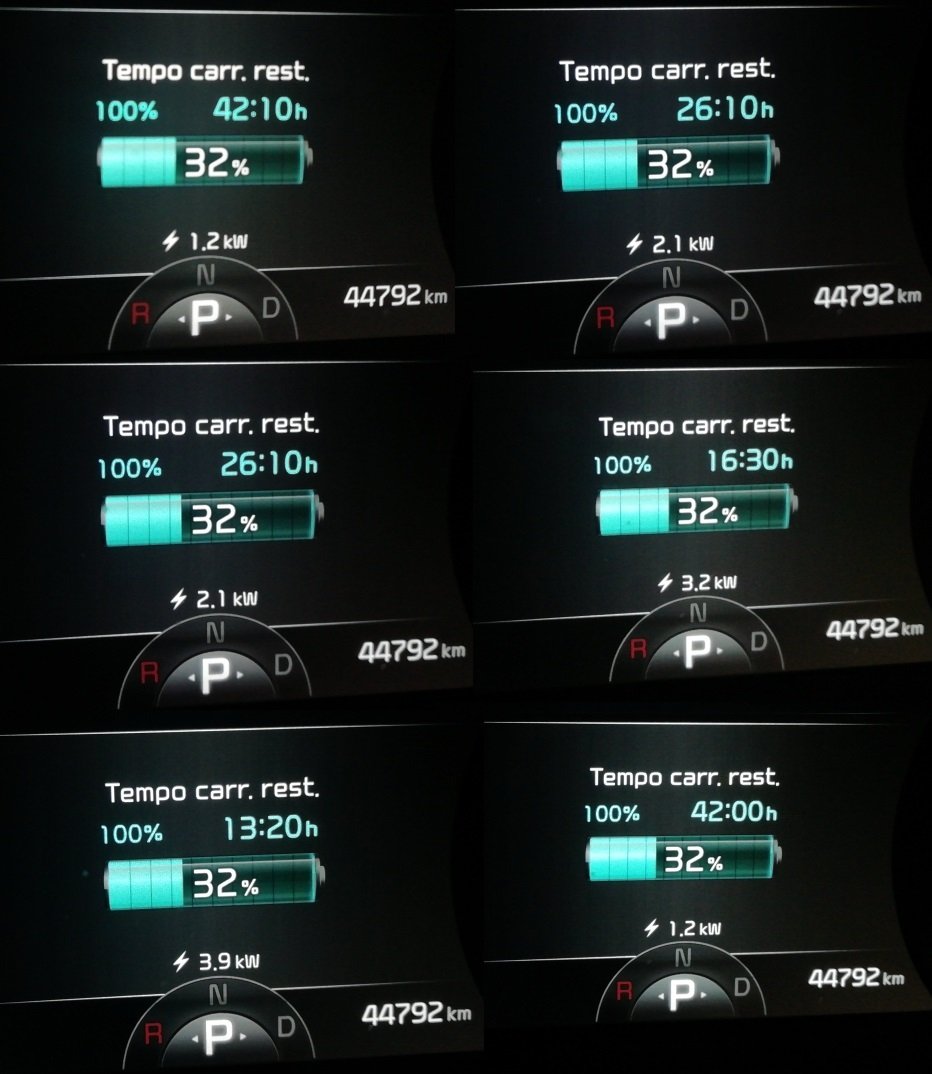 Uma compilação dos tempos, para as diversas potências de carregamento, previstos pelo carro quando o pus a carregar pela primeira vez.