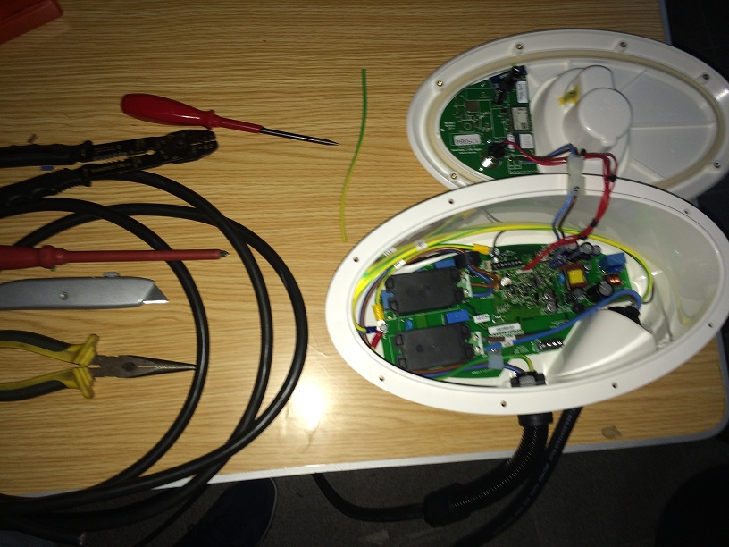 Entranhas abertas para trocar as pontas de fio que ele traz por um cabo 3x4mm^2 com tomada CEE16 (esqueci-me de tirar o cartão SIM mas funciona na mesma)