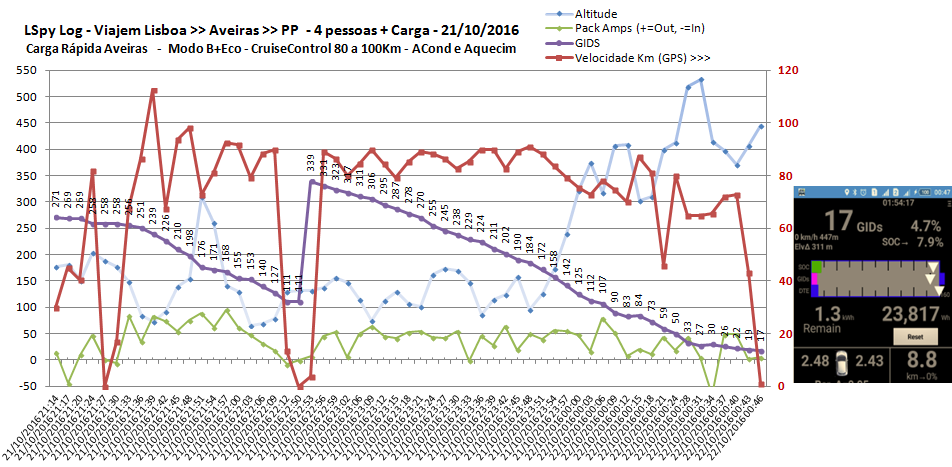 E neste caso há pormenores que aumentam os W/Km bem acima dos 12 ou 13 que faço na cidade. Um deles é a autoestrada com velocidades permanentes. O outro é o tempo frio e carro cheio que implica levar o aquecimento e o ar condicionado sempre ligados. Ainda não fiz as contas mas ainda vou fazer (com os dados do LSpy) do consumo de acessorios.