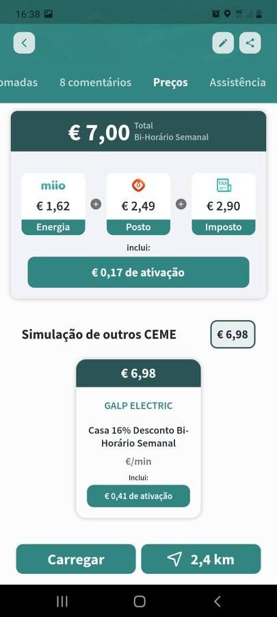 Eu neste momento na app miio tenho 4 CEMES (Miio, prio, Galp e EDP) hoje estive a fazer uma simulação no PCR do Lidl de Vendas Novas dos 20% aos 80% (16.8kWh em 22 minutos) e o mais caro é a Galp com 6.45€, depois a Prio com 5.71€, a Miio com 5.65€, e o mais barato mas porque tenho o cartão UVE/EDP com 22% fica em 5.62€.