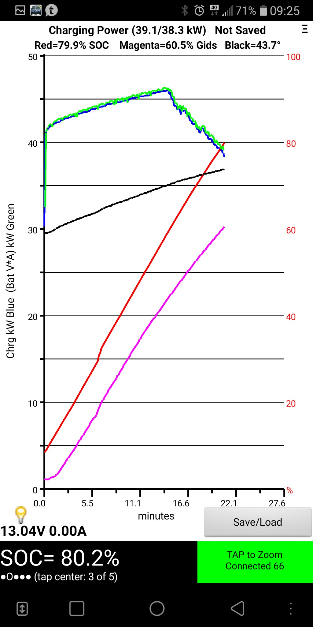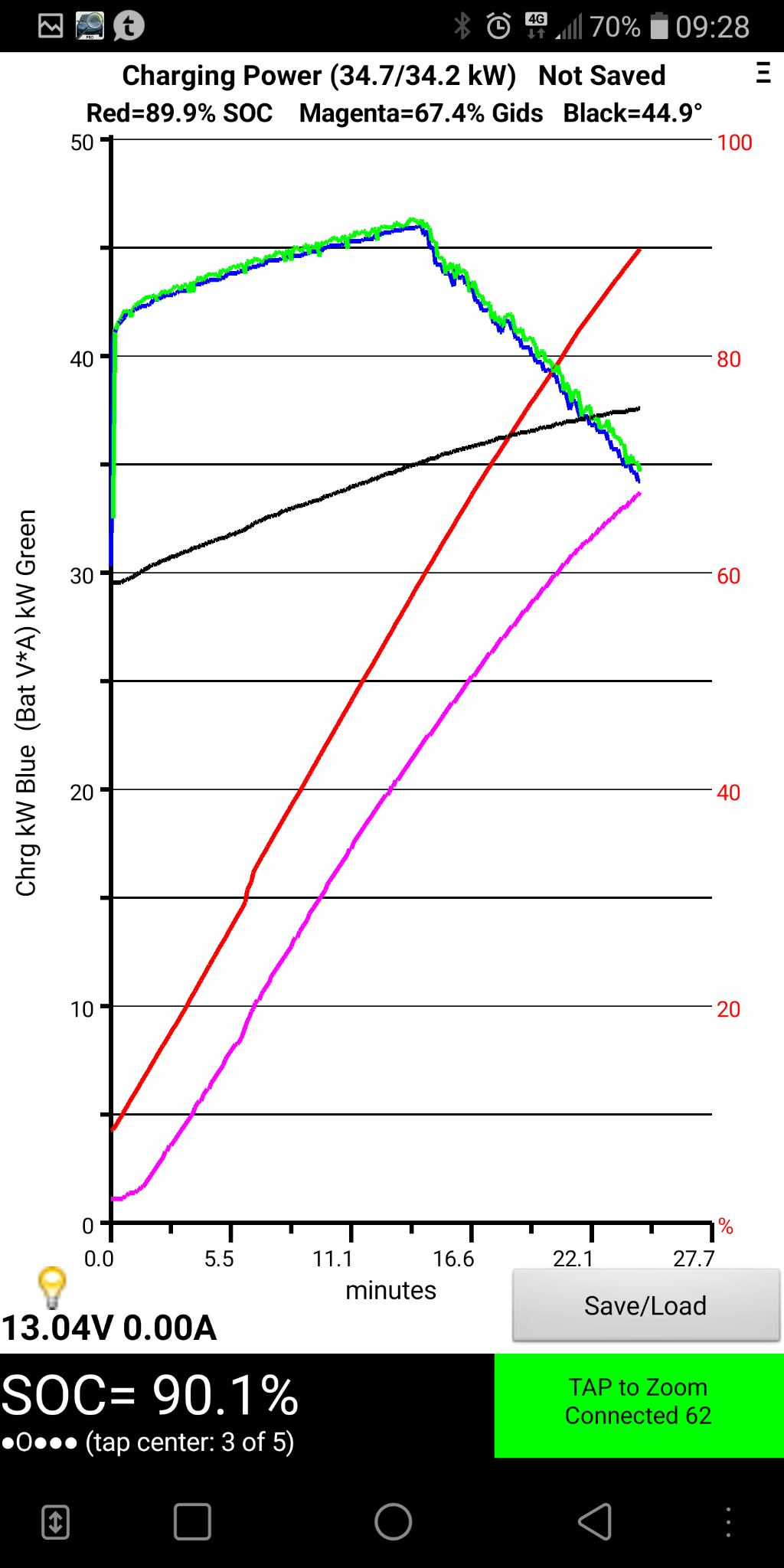 Como podes ver, começava nos 46kW, até subia aos 49kw e a partir de 40% era sempre a descer.