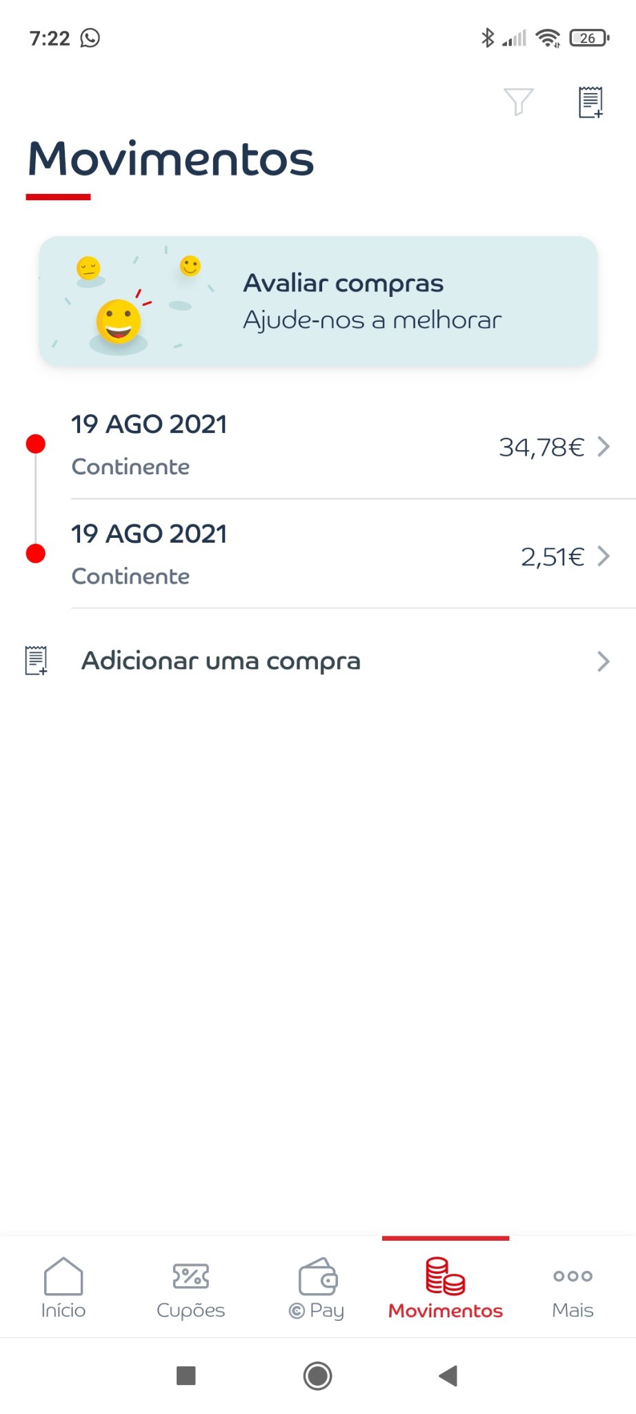 O valor aparece na app continente, olha aí a minha, só tem mesmo aquelas transações (ainda não usei o valor oferecido do carregamento, não voltei ao continente)