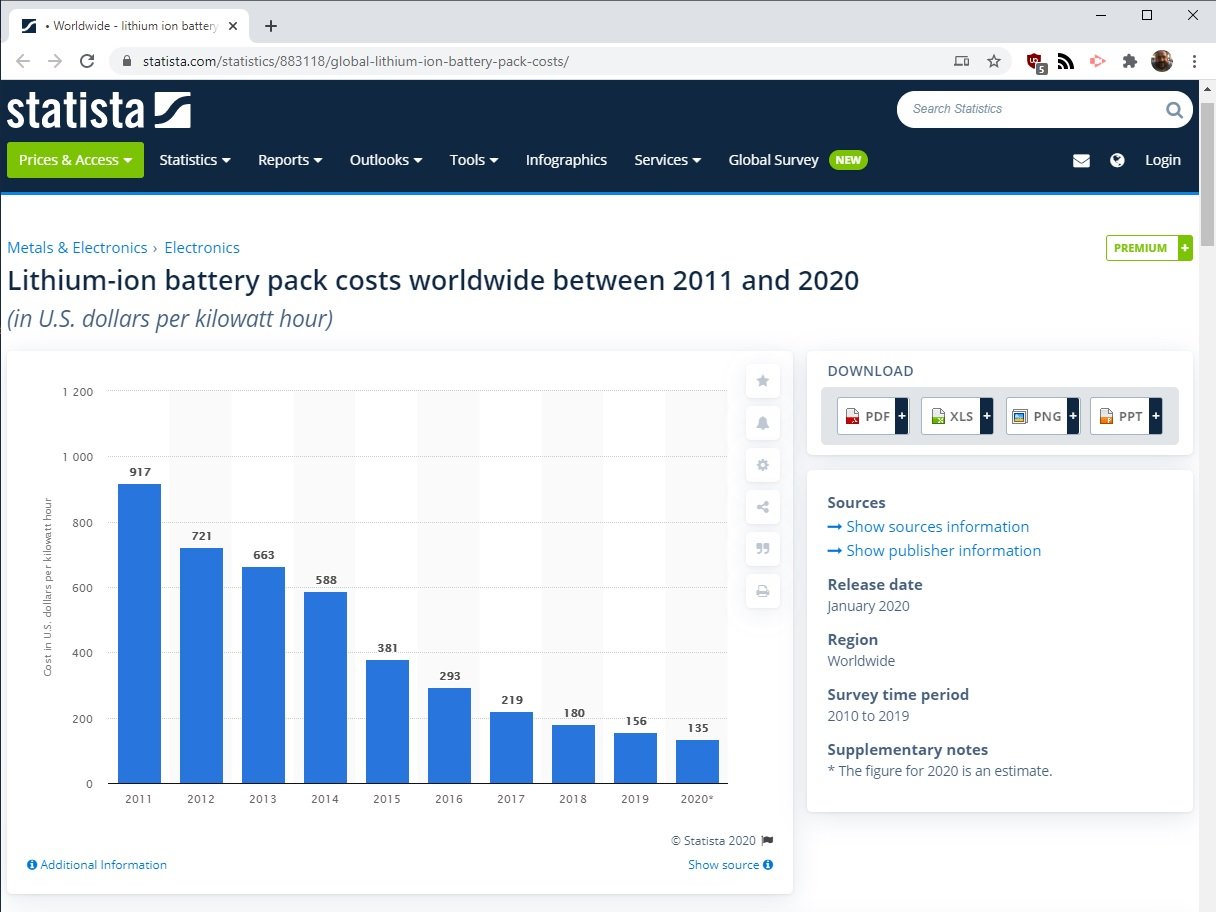 https://www.statista.com/statistics/883 ... ack-costs/, o preço por kWh para a indústria automóvel foi em 2019 de 156$ (cerca de 132€) com previsão de 135$ (cerca de 114€) para 2020.