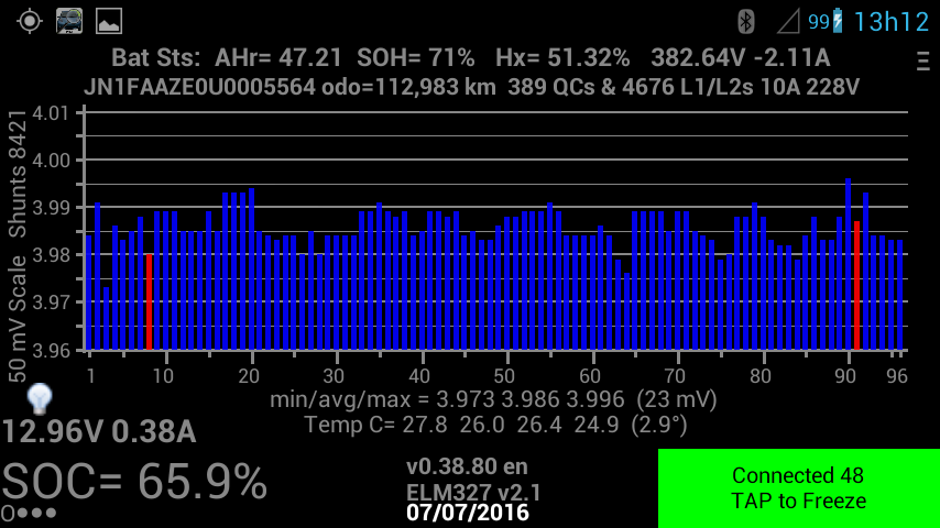 Os 47,21Ah significam que a 10ª barra está quase a cair. No entanto penso que o LBC está muito pessimista com a capacidade pois 47,21Ah dariam um teste da tomada de aproximadamente 18kW.h, e há um mês ele carregou mais de 19kW.h...