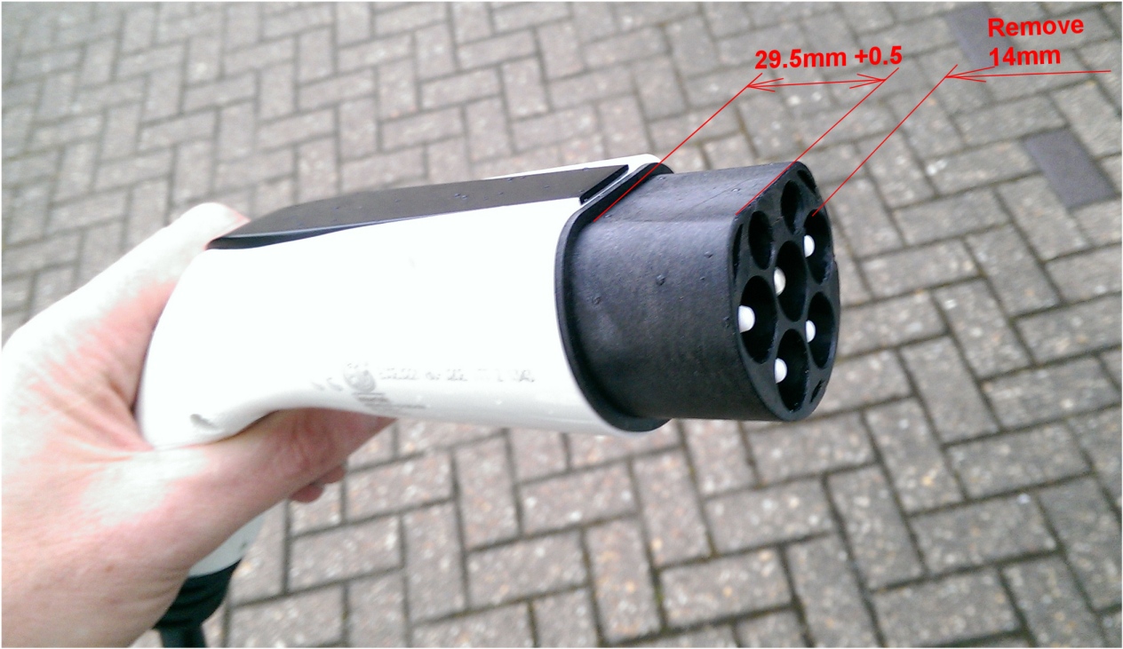 "The modification to the Type 1 plug consists of the removal of 14mm from the end of the plug which allows it to properly mate with the female Type 2 plug or a Type 2 socket. Note: This modification also renders the Type 2 plug un-lockable in a locking EVSE socket."