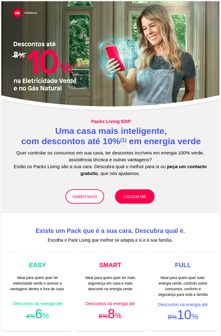(1) Descontos no fornecimento de energia (eletricidade verde ou eletricidade verde e gás natural com compensação de CO2), condições especiais nos serviços Funciona e EDP Saúde e acesso a um conjunto de vantagens exclusivas. Disponível no fornecimento de eletricidade, nas tarifas simples e bi-horária para potências contratadas de 3,45 a 20,7kVA. Disponível no fornecimento de gás natural nos escalões 1 a 4. Os descontos no fornecimento de energia incidem sobre o valor total da fatura (potência contratada e energia consumida na eletricidade, termo fixo e energia consumida no gás natural) e são calculados face ao preço de referência da EDP Comercial, não incluindo o valor das taxas e impostos. Os descontos na energia pressupõem adesão ao débito direto e fatura eletrónica e serão alterados caso o cliente opte por outro meio de pagamento ou outra modalidade de faturação. Os descontos de energia indicados são promocionais, válidos para novas adesões até 30 de novembro de 2021 e vigoram pelo período de 12 meses. No final deste período os descontos de energia aplicados serão os descontos standard em vigor dos Packs Living EDP. Oferta exclusiva para clientes residenciais da EDP Comercial. A mensalidade do pack pressupõe que tenha ou celebre simultaneamente um contrato de fornecimento de energia com a EDP Comercial (eletricidade ou eletricidade e gás natural). Ao valor da mensalidade acresce o valor da fatura de energia. A adesão ao pack pressupõe um contrato com duração de 12 meses, não aplicável ao contrato de fornecimento de energia.
